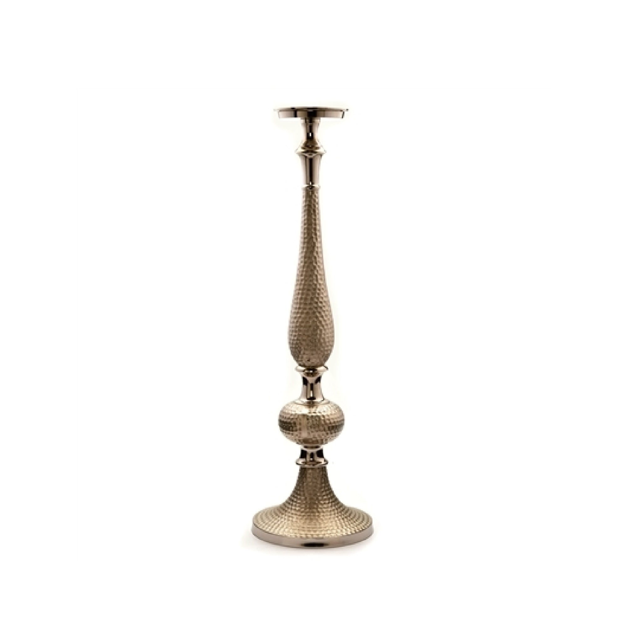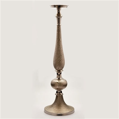 This aluminum candle holder has been designed to transform your home with its classic design combined with a hammered finish. The hammered portion has a satin silver finish which is alternated by a shiny silver finish. Also available in a copper hammered finish.