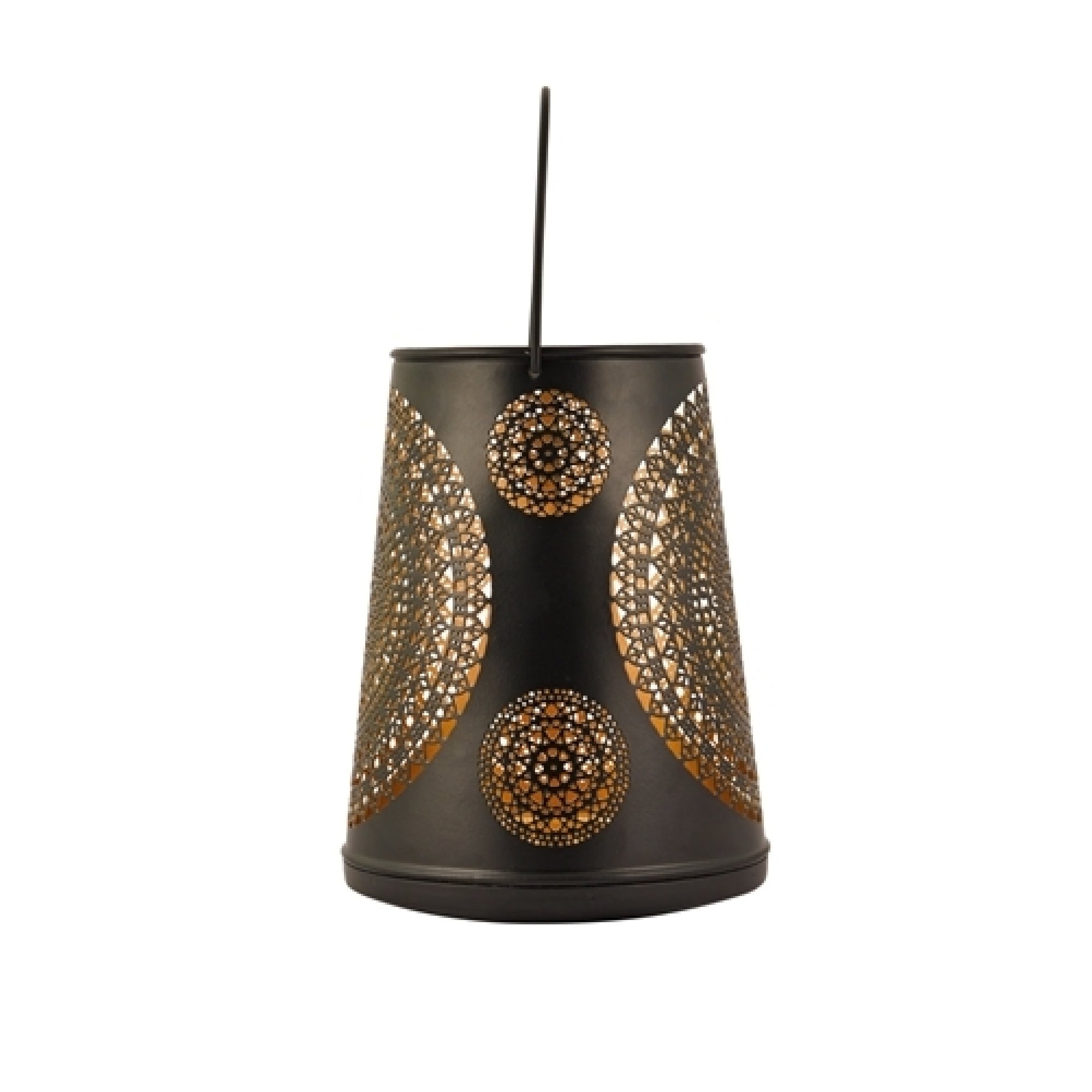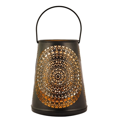 This tealight candle holder has a unique conical shape and an exquisite laser cut pattern. When lit the design creates a serene shadow that instantly makes the room cozy and inviting. This candle holder can be hung or used as a tabletop accent piece. The candle holders come in a black and gold color combination. These candle holders are perfect for all occasions and can be used in any room.